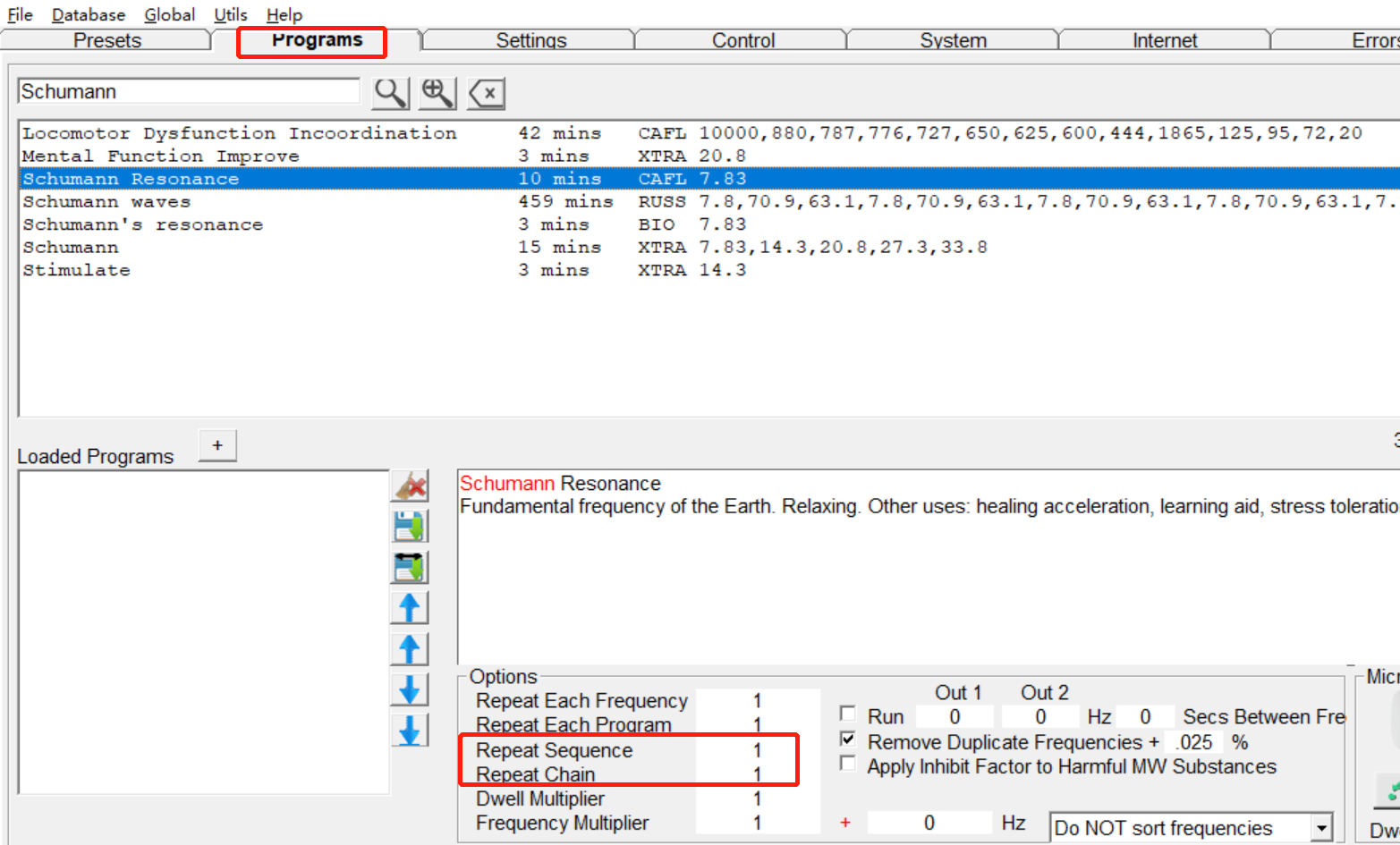 Type 0 next to 'repeat sequences' or 'repeat chain' in the program tab to loop a program forever until you manually stop it.